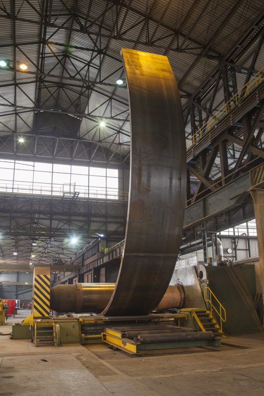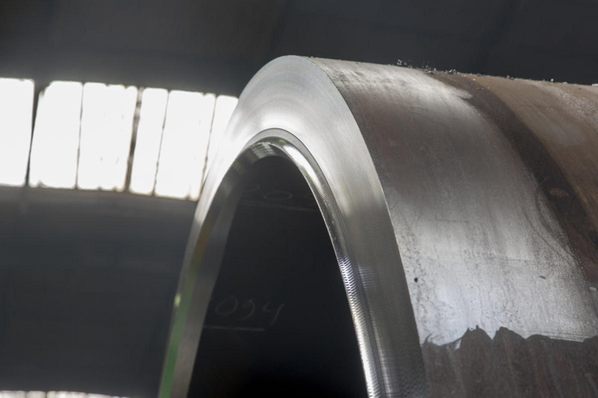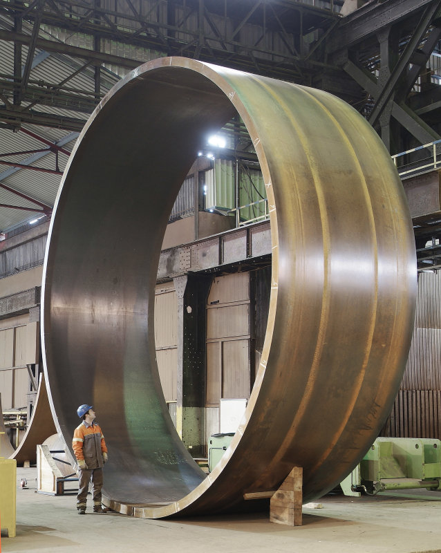 Zum Umformen der Mantelbleche nutzen wir leistungsfähige Vier-Walzen-Biegemaschinen, die stärkste mit einer Umformkraft von 8.600 t und einer zylindrischen Länge bis 4.250 mm. Ausgestattet ist die Maschine mit drei Wechselwalzen jeweils im Durchmesser 880 mm, 1.200 mm und 1.500 mm. Diese Maschine wurde speziell für die Kaltumformung von schweren Blechen aus hochfesten Stählen mit einer Streckgrenze von mehr als 500 MPa konzipiert – als Alternative zu geschmiedeten Mantelschüssen.